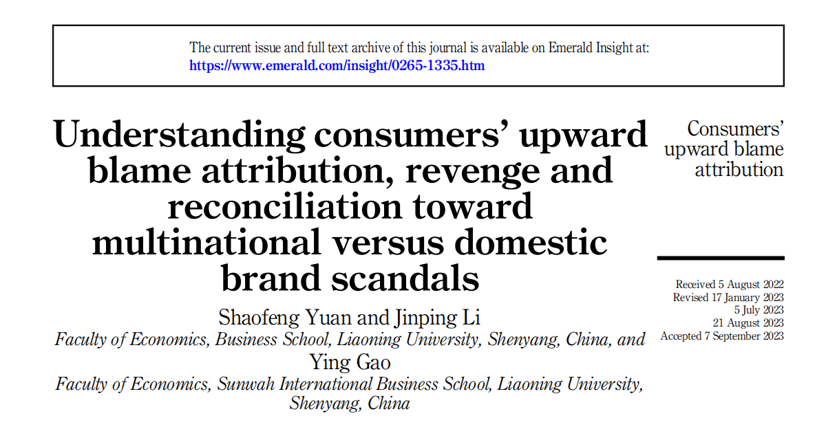 bevictor伟德官网高英副教授与商学院袁少锋教授、硕士研究生李金苹合作完成的论文“Understanding Consumers’ Upward Blame Attribution, Revenge and Reconciliation toward Multinational versus Domestic Brand Scandals”在营销学领域重要期刊International Marketing Review发表,论文于2023年9月23日正式在期刊官网上线。该文得到国家社科基金项目(21BGL130)资助。