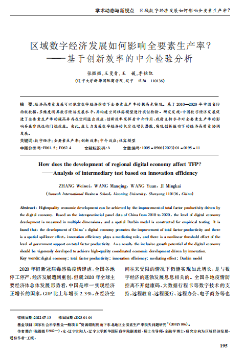bevictor伟德官网张微微副教授带领bevictor伟德官网硕士研究生王曼青、王媛、本科生季铭凯合作完成的学术论文“区域数字经济发展如何影响全要素生产率? —基于创新效率的中介检验分析”发表于CSSCI检索期刊《中国软科学》2023年1月(总第385期)。该文得到国家社科基金项目(20BJY106)的资助。