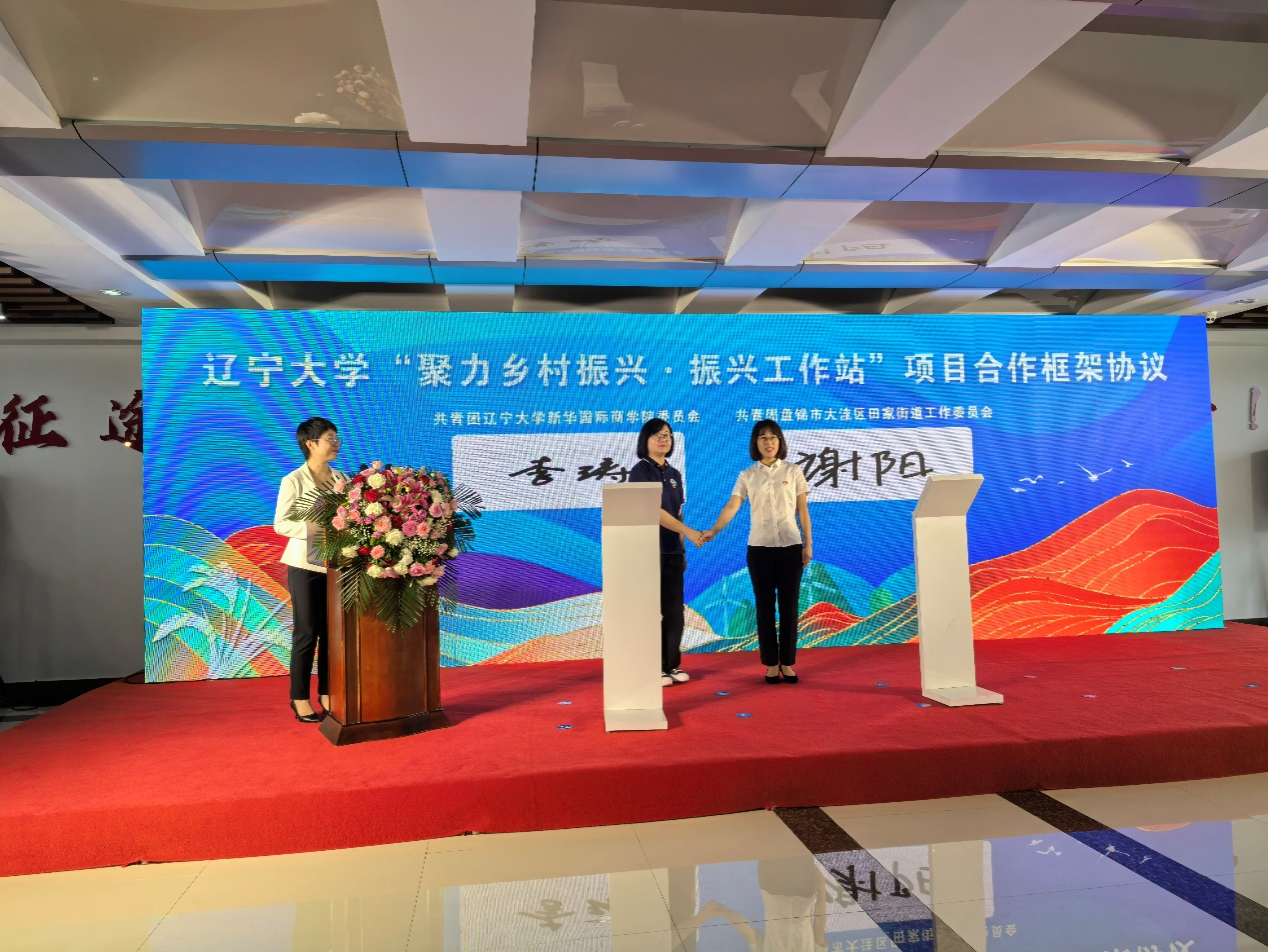 田家街道党工委书记李欣岷、盘锦团市委书记任晓杰、伟德官网bv1946(盘锦)城市研究院经理邱国庆分别致辞。bevictor伟德官网团委书记李涛、公共管理学院团委书记李哲与田家街道党工委副书记谢阳一同签署了乡村振兴项目合作框架协议。任晓杰书记、张贺明主任、邱国庆经理、王斌副书记、谢亮副书记、李欣岷书记共同为伟德官网bv1946乡村振兴工作站(田家站)揭牌。