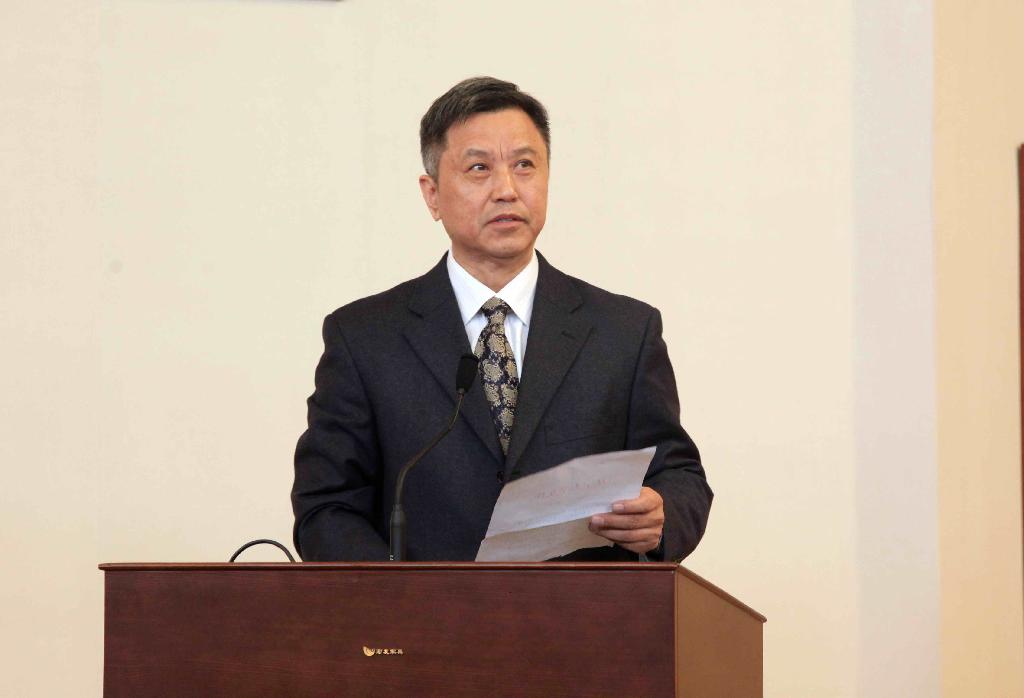 副董事长穆怀中宣读学校文件《关于伟德官网bv1946蒲河校区国际学术报告厅冠名为蔡冠深学术报告厅的决定