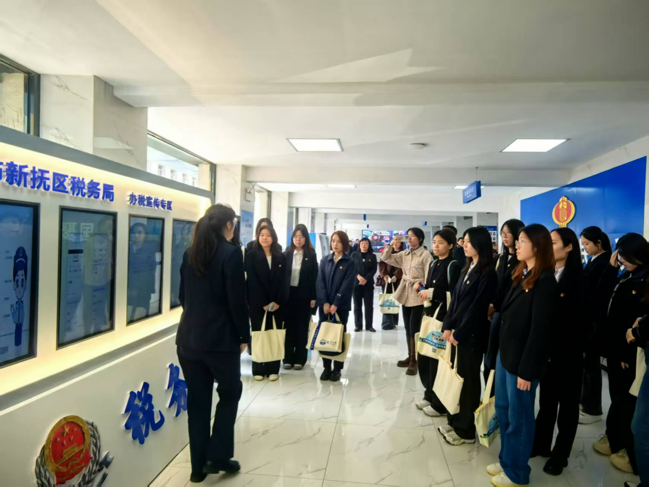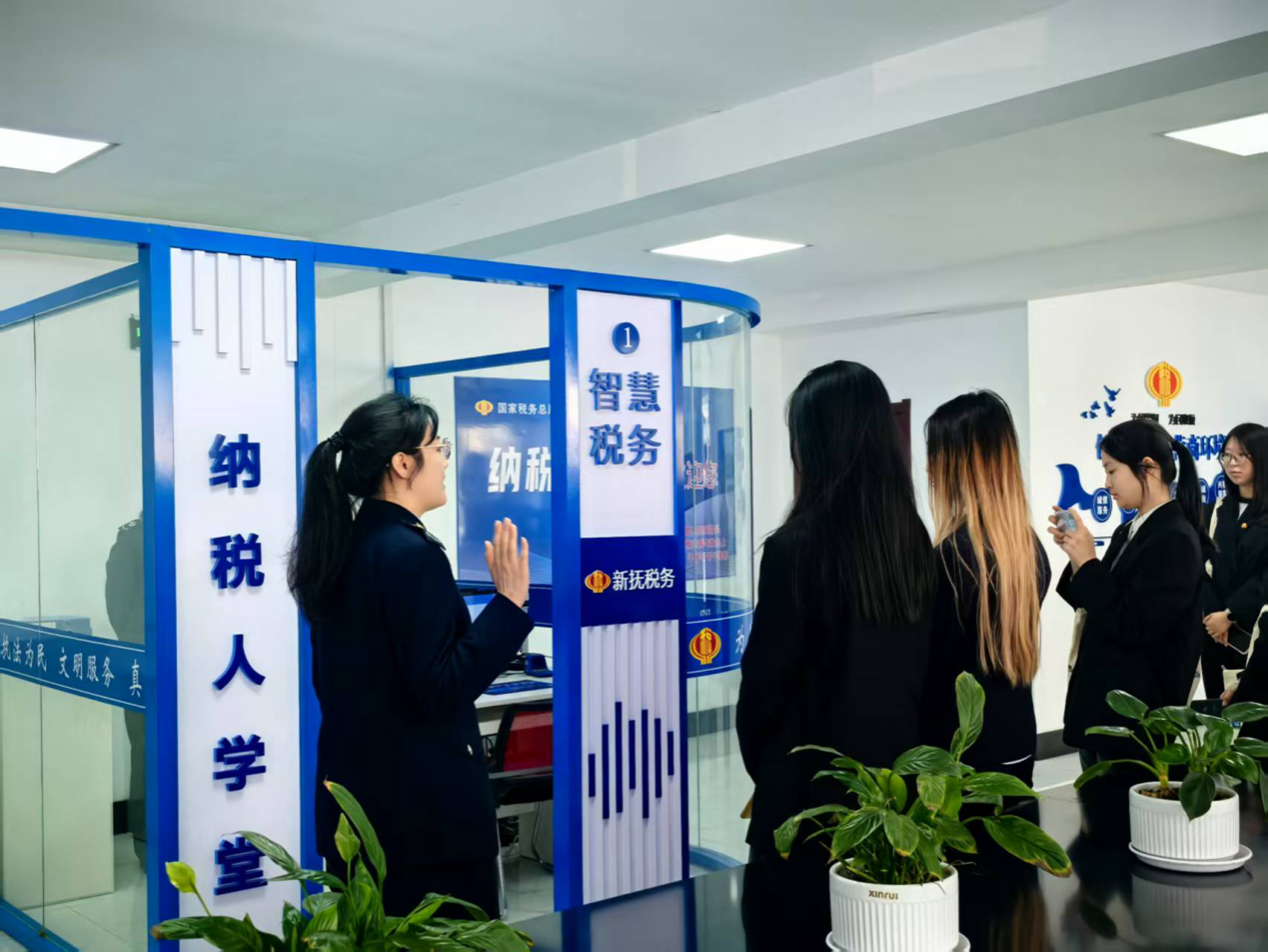 签约仪式后,学院师生代表来到新抚区税务局办税大厅参观,工作人员详细讲解了纳税种类和办税流程,带领师生感受了智慧税务带来的数字化便捷和“科技温度”,使师生在现实场景中深入了解了新抚区税务局“党建+业务”工作经验。